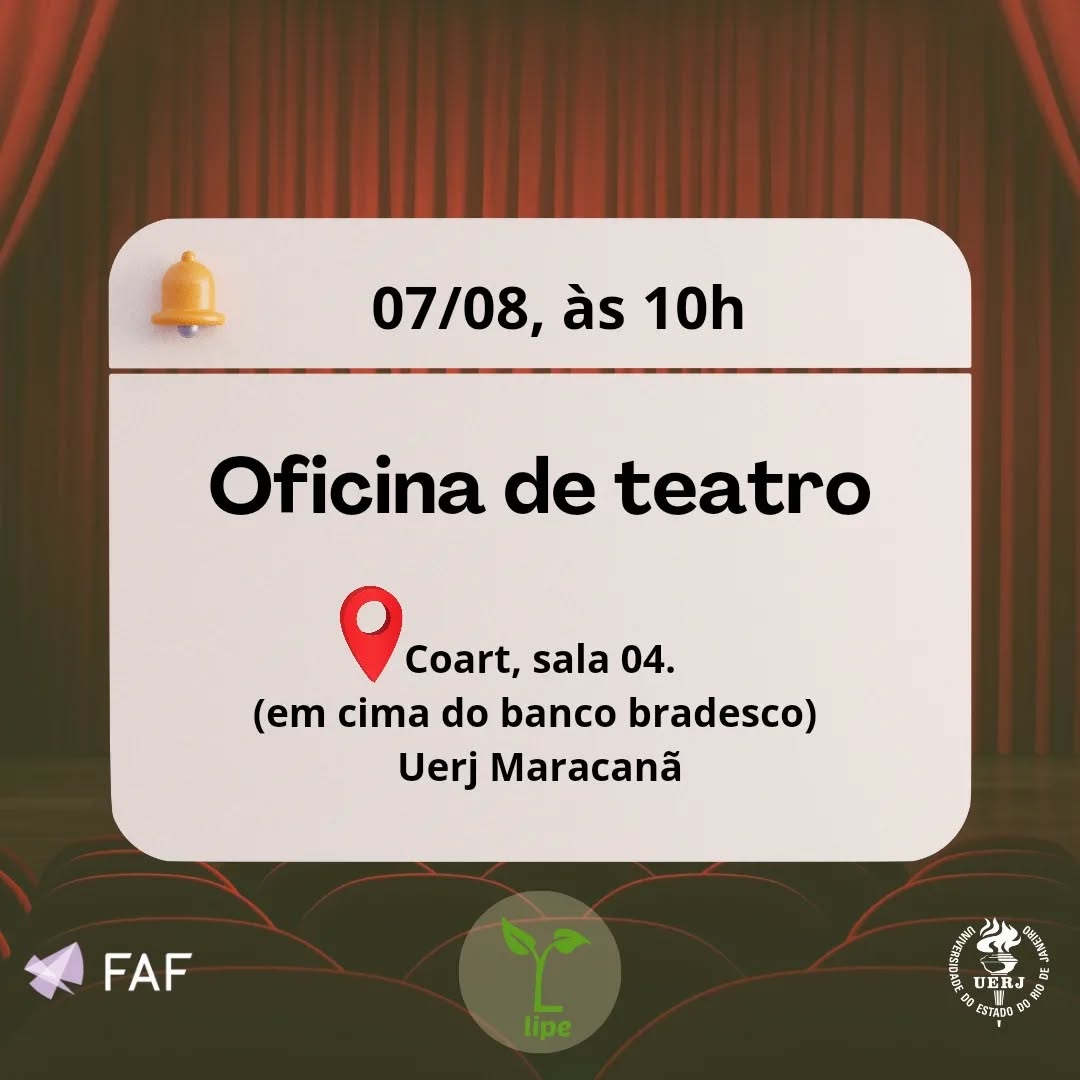 No próximo dia 07 de agosto de 2024, será realizada a Oficina de Teatro, na sala 4 do COART, localizada no campus da UERJ, acima do Banco Bradesco.